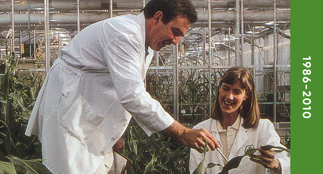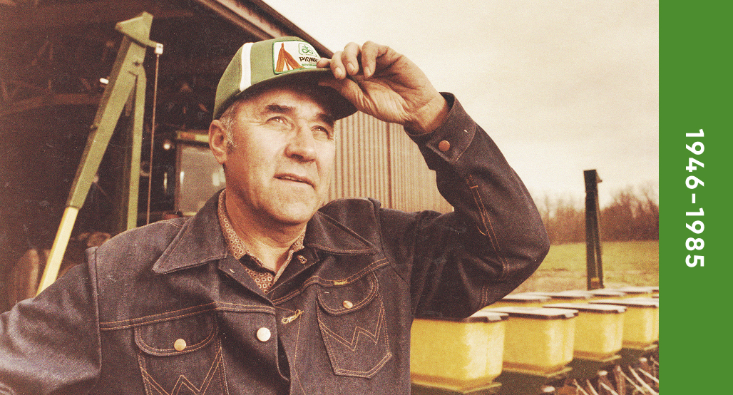 As the space race took off, so did farm yields — soaring to new heights thanks to innovations like farm mechanization and nitrogen fertilizers. Pioneer pushed progress even further, building a research center to improve drought tolerance in corn and creating our very first official agronomy team. Plus, we explored new frontiers, expanding our crop offerings to soybeans and beyond.