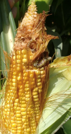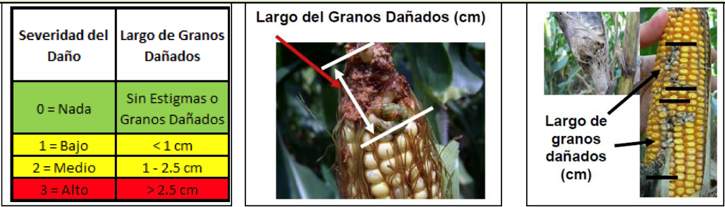 Daños directos: Helicoverpa zea se alimenta en una primera etapa de los estigmas y posteriormente de los granos hasta R3 (Foto 3). Esto es fácilmente cuantificable (Grafico 1) y puede llegar a pérdidas de hasta el 16% (Michelotto 2013). Spodoptera frugiperda puede ingresar a la espiga a través de las chalas y en algunos casos ataca en la base de la espiga provocando el desprendimiento de esta al momento de la cosecha.