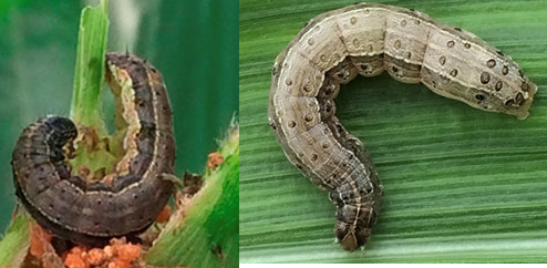 Spodoptera frugiperda (Gusano cogollero o Cogollera; Foto 2): es una especie menos frecuente de encontrar en espigas a excepción del Norte Argentino. El adulto presenta alas de 17 a 18 mm de envergadura, las anteriores poseen máculas marrones, grises y blancas. Las alas posteriores son claras. La larva alcanza 4 cm de longitud y su color varía de acuerdo a la alimentación. Es polífaga y actúa tanto en etapa vegetativa como reproductiva del maíz.