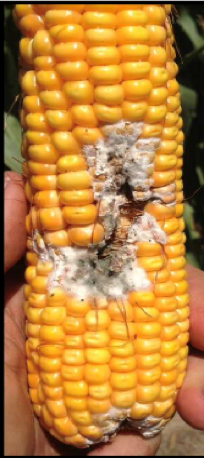 Daños indirectos: el daño a la espiga favorece el crecimiento de hongos como Fusarium spp. (Munkvold 2003) o Aspergillus spp. los cuales producen micotoxinas (fumonisina, DON o aflatoxinas). Estas toxinas pueden generar en animales y humanos que la consumen inmunosupresión, depresión en el consumo de alimentos, enfermedades crónicas hasta inclusive la muerte (De la Campa 2005, Barroso 2017) Esto genera pérdidas de la calidad comercial del grano, con importantes descuentos. (Foto 4).