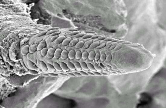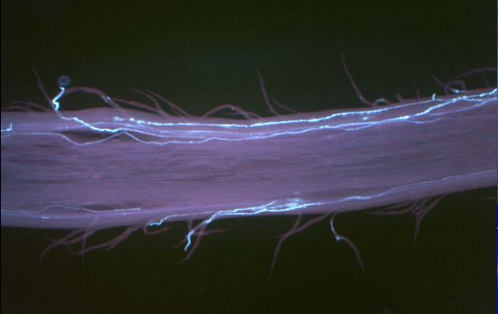 Figura 4. Tubos polínicos creciendo a lo largo del tejido vascular de las barbas.