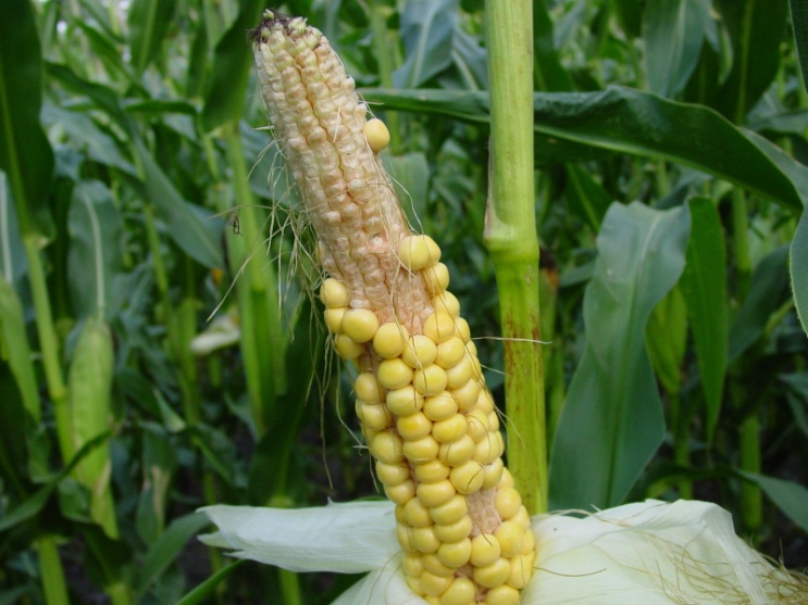 Un estrés hídrico severo desde el fin de la etapa vegetativa en adelante puede generar un incremento en el intervalo entre la emisión de polen (floración masculina) y la aparición de estigmas (floración femenina). Esto puede generar que al momento de la aparición de los estigmas ya no haya polen en abundancia dando lugar a una polinización incompleta de las espigas (Figura 5). Los óvulos no fertilizados comienzan a desintegrarse y desaparecen antes de que la espiga alcance la madurez fisiológica.