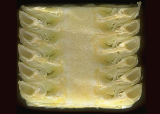 La Figura 2 muestra una espiga cosechada en el estadío V12. El domo meristemático no está presente, lo que indica que la formación de nuevos óvulos ha cesado quedando establecido el número potencial de granos de esa espiga. La formación de los pares de óvulos es visible a lo largo de toda la espiga.