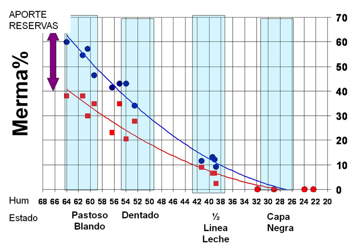 Durante la etapa efectiva de llenado los granos demandan asimilados a tasa constante. El peso de los granos está determinado por un componente potencial (alta influencia genética “fijo”) y otro ambiental (condiciones de llenado). Los cambios en el peso de grano por efectos ambientales son modulados por la relación entre la demanda diaria de la espigas para llenar dichos granos y la oferta de carbohidratos que sostengan dicha demanda. Debido al mayor potencial de rendimiento (más demanda), los híbridos modernos de maíz son más dependientes de buenas condiciones durante el llenado de granos para no ver afectado el peso de los mismos (Echarte et al., 2006). La intensidad y el momento del estrés durante el llenado condicionan la magnitud de la merma en el rinde (Borrás et al., 2004). Dicho concepto se expresa en la Figura 8. La línea azul representa las mermas de rendimiento observadas cuando se cosechan las espigas de manera anticipada. Por ejemplo; espigas cosechadas en grano pastoso blando tienen una merma de rendimiento del 60% mientras que espigas cosechadas en media línea de leche presentan una merma de rinde del 12%.