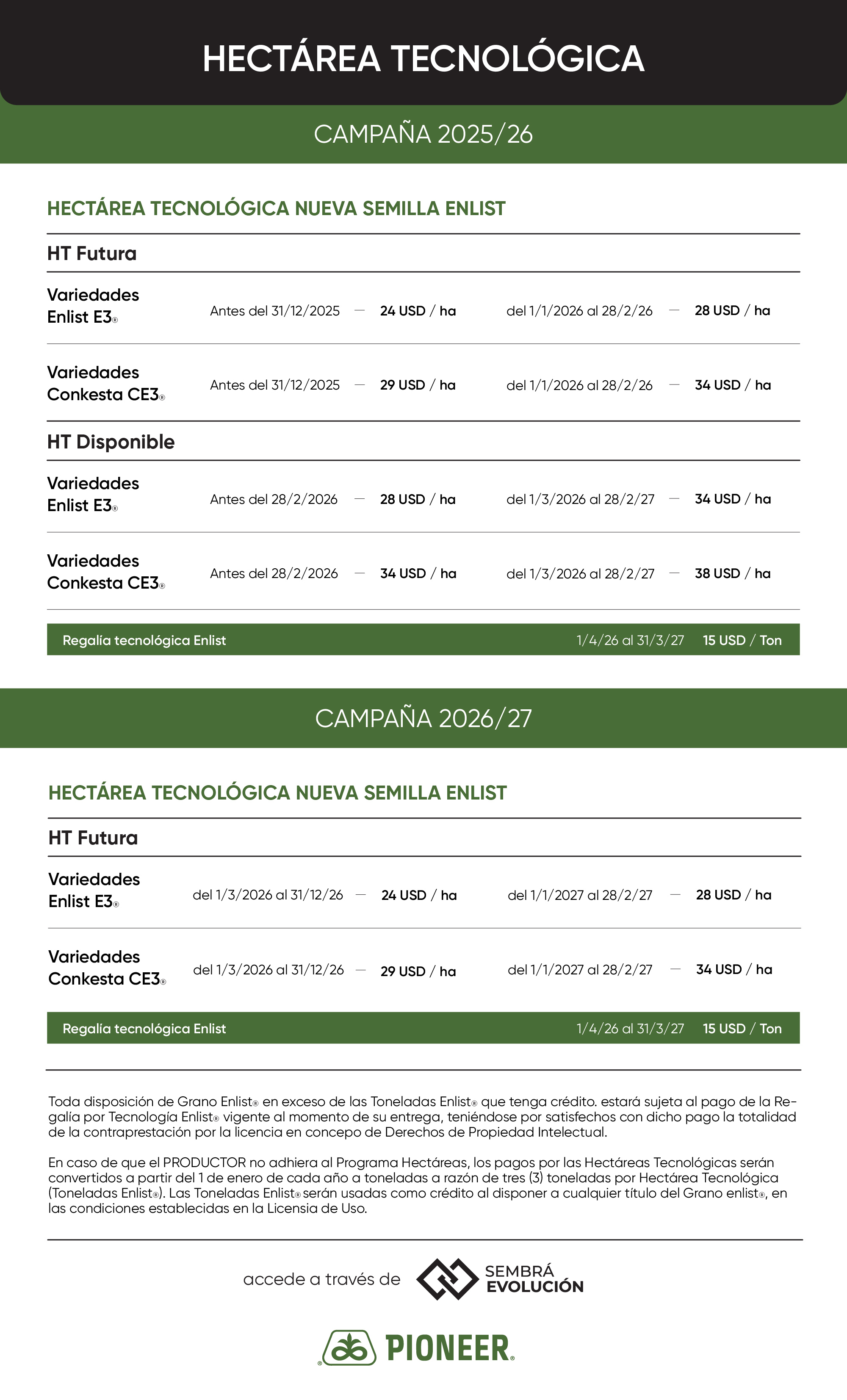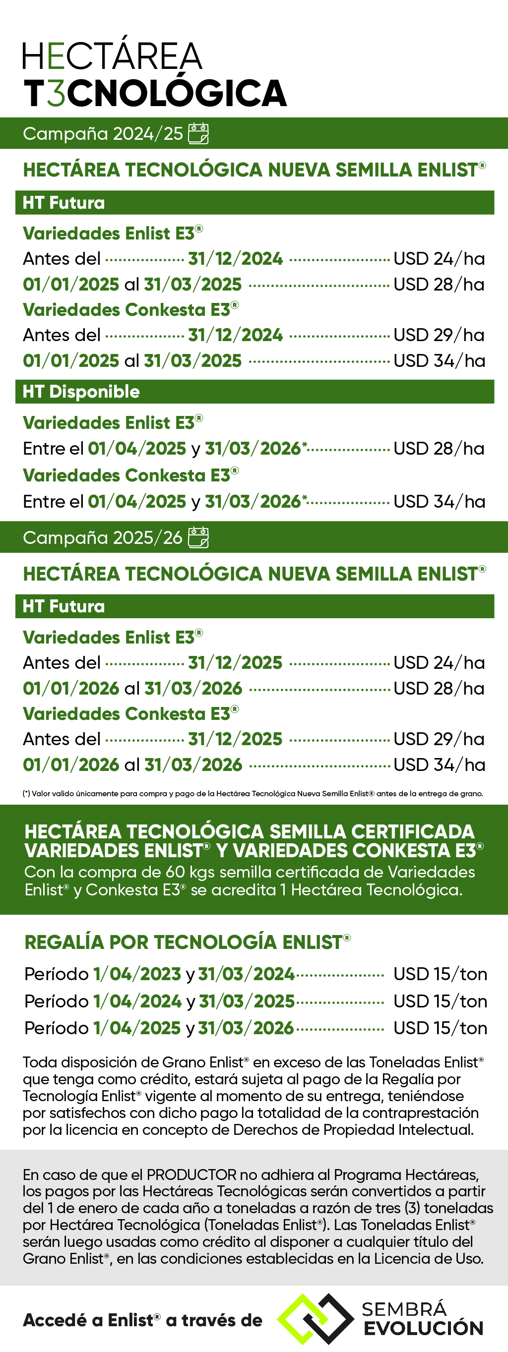 Sembrá EvoluciónMayor potencial de rendimiento del mercado. Con Tecnología Enlist E3® . Variedad Grupo 4 Corto con Excelente adaptación al Norte, Oeste, Centro y Sur de Buenos Aires. Sur de Santa Fe y Sudeste de Córdoba. Este de San Luis.