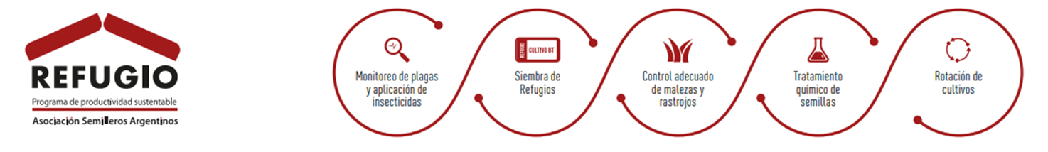 3. Siempre sembrá refugio estructurado en un mínimo de 10% de la superficie a no más de 1500 mts, con un hibrido no Bt de ciclo similar de madurez, siguiendo las configuraciones detalladas en http://www.programamri.com.ar/. Esto permite proveer adultos susceptibles que puedan cruzarse con los resistentes generados en la porción Bt del lote, manteniendo baja la frecuencia de insectos resistentes a la tecnología. Así se preservará la tecnología Bt en el tiempo, disminuyendo la aplicación de insecticidas y promoviendo la sustentabilidad del sistema.