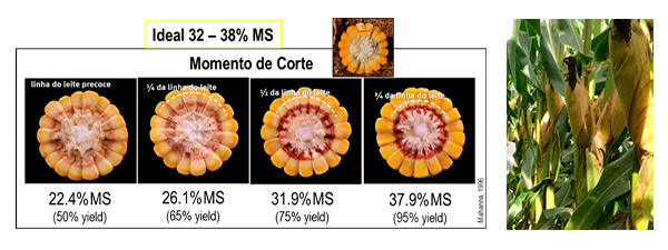 • A primeira é que a matéria seca esteja com teor entre 32 a 38% MS (considerado o melhor intervalo para preservar a digestibilidade de fibra x acúmulo de amido).