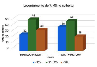 Na região avaliada em Minas Gerais, as colheitas fora do momento ideal, em sua maioria, foram feitas abaixo de 30% de MS, principalmente por limitações operacionais. Isso se deve à escassez de colhedoras automotrizes, já que a maior parte das colheitas é realizada com colhedoras acopladas a tratores, equipamentos que, em geral, possuem menor capacidade de processamento.