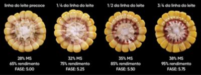 A colheita da silagem em estádios mais precoces (<30% de matéria seca) proporciona a impressão de maior produtividade de massa, maior facilidade no corte e melhor compactação. No entanto, essas vantagens são acompanhadas por uma redução significativa no teor de amido (responsável por 65% da energia presente na silagem), fermentações inadequadas devido ao excesso de umidade, formação de efluentes e perdas expressivas de matéria seca, que podem ultrapassar 20%. Ao comparar a colheita em 25% de matéria seca com o ponto ideal de 35% de matéria seca, conforme demonstrado, observa-se uma redução de aproximadamente 10.924 litros de leite por hectare em energia, correspondendo a um valor econômico próximo de R$ 30 mil por hectare.