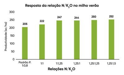 No cenário de médio investimento foi registrado incremento de produtividade de 8,3% na relação 1:1, comparado com o padrão produtor. Quando aumentada apenas a dose de K2O, foi registrado acréscimo de 20% na relação 1:1,25, também em comparação ao padrão. Os resultados demonstraram que as plantas de milho submetidas às relações 1:1,25 e 1,25:1 também apresentaram incremento de produtividade (avaliar precificação dos adubos).