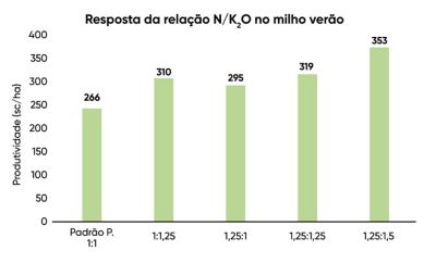 A melhor produtividade foi aquela com 180kg/ha de N e 144kg/ha de K2O, com a relação N/K2O de 1.25. Neste estudo, as melhores produtividades (independente da dose trabalhada de N) foram quando a relação N/K2O estava na relação 1.25.