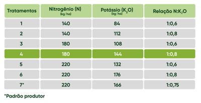 Durante a safra verão de 2021, o time de agronomia Centro Norte da Pioneer® no estado de Goiás conduziu um ensaio na Estação de Pesquisa da Corteva, em Planaltina/GO, testando diferentes relações N/K2O conforme o quadro detalhado abaixo. O híbrido testado foi o P3707VYH.