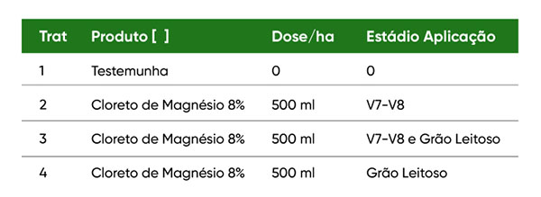 Produtividade: Observou-se um incremento na produtividade nos três tratamentos em que foi aplicado o Cloreto de Magnésio [ ] 8%, comparado à testemunha. Os tratamentos com as melhores respostas foram: T3 (Aplic. V7-V8 e Grão leitoso), T2 (Aplic. V7-V8), respectivamente, porém, ressaltamos que o T2 quando comparado ao T4, a aplicação feita apenas V7-V8, o incremento em produtividade foi muito maior que o T4 comparado a Testemunha, assim podemos dizer que apenas uma aplicação no estádio V7-V8 (T2), foi eficiente
