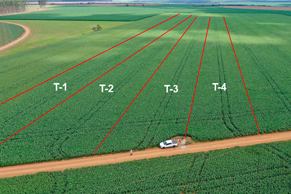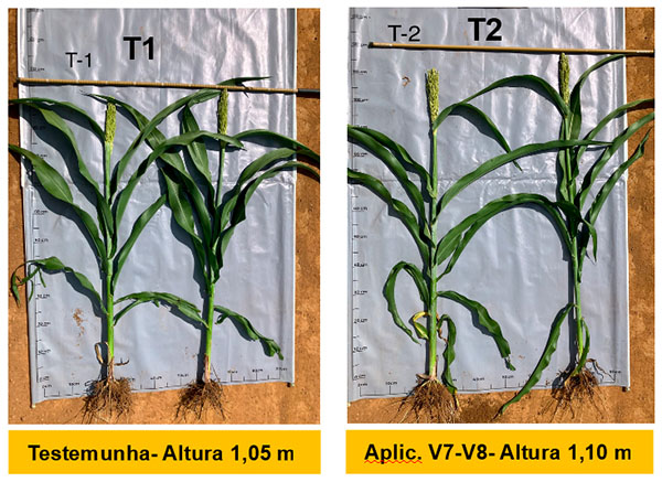 Quanto ao tamanho de plantas, avaliação 15 dias após a primeira aplicação, observou-se um incremento de altura média de plantas no Tratamento-2 (Cloreto de Magnésio foliar no estádio V7-V8), 5 cm a mais de altura, comparado à testemunha.