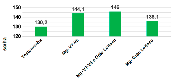 Tivemos um incremento de 16,2 sc. comparado a testemunha no tratamento onde foi aplicado o Mg em V7/V8 e Grão Leitoso, mostrando respostas do sorgo à aplicação do Magnésio foliar.