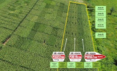 Foram avaliados os híbridos P3322PWU, P3016VYHR e P40537PWU, cultivados em faixas de 100 metros lineares, com oito linhas por híbrido. A aplicação de UtrishaTM N foi realizada no estádio V4, em quatro linhas por híbrido, isoladas lateralmente com lonas, formando faixas comparativas com outras quatro linhas sem o tratamento.