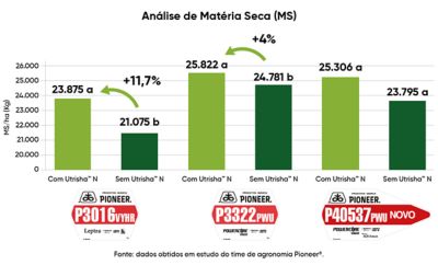 O P3016VYHR apresentou aumento de 11,7% de produtividade no tratamento com UtrishaTM N, em comparação com a área de controle sem aplicação. Já o P3322PWU registrou crescimento de 4%, no mesmo cenário.