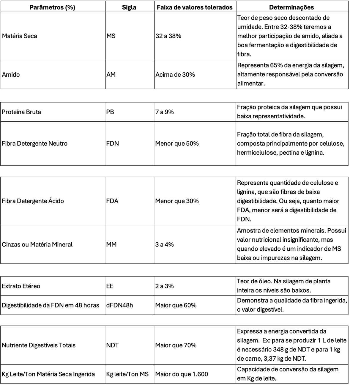 Com os resultados em mãos, fica mais fácil balancear de forma mais eficiente e econômica a dieta do rebanho porque se sabe exatamente quais são as potencialidades da silagem. Nos quadros abaixo, estão descritos os parâmetros da análise bromatológica e suas respectivas informações. Afinal, não basta somente receber a análise bromatológica, é preciso saber interpretá-las.