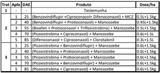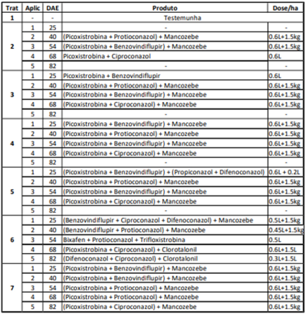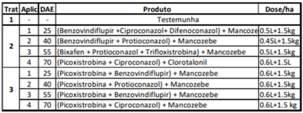 Tabela 3. Lista de tratamentos para cultivar 98R30CE e a concorrente suscetível em Sinop-MT.