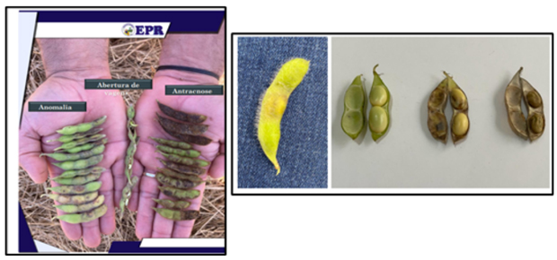 Desde a safra 2019/2020, o estado de Mato Grosso vem sofrendo com a ocorrência da anomalia das vagens na cultura da soja em diferentes regiões, principalmente nos municípios próximos à BR-163. Os sintomas desta doença iniciam a partir da metade do enchimento de grãos (R5.4), caracterizando-se pelo apodrecimento dos grãos e das vagens em geral, observado de dentro para fora das vagens e, em alguns casos, pelo quebramento das hastes próximo ao colo da planta. Diferentes instituições de pesquisa e empresas de melhoramento genético vêm trabalhando na identificação do agente causal desta doença, porém ainda não há um consenso científico. Análises realizadas nas hastes, grãos e vagens com e sem sintomas apontam uma frequência de 50% de ocorrência do complexo de fungos Diaporthe/Phomopsis e 61% do fungo do gênero Colletotrichum, agente causal da antracnose. Na literatura internacional, o que chamamos de Anomalia das Vagens é descrito como Seed Decay, ou seja, Podridão dos Grãos, causada principalmente pelo fungo Diaporthe longicolla/Phomopsis spp. Mesmo assim, a presença dos fungos foi verificada até mesmo em plantas sadias, dificultando a definição correta do agente causal.