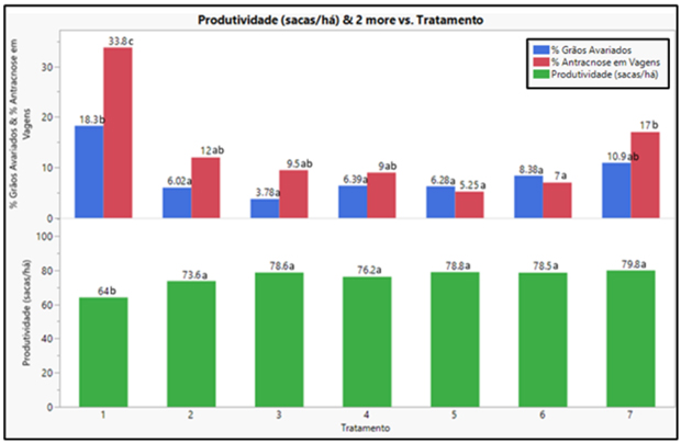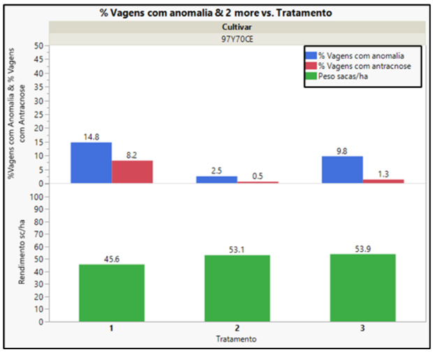 Figura 2. Percentual de vagens com anomalia, vagens com antracnose e produtividade dos tratamentos com a cultivar 97Y70CE no ensaio de Nova Mutum-MT.