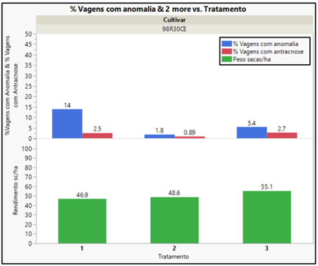 Figura 3. Percentual de vagens com anomalia, vagens com antracnose e produtividade dos tratamentos com a cultivar 98R30CE no ensaio de Nova Mutum-MT.