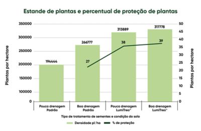 O tratamento de sementes com LumiTreo® proporcionou uma proteção de estande 61,4% superior em relação ao TSI padrão, especificamente na área com menor capacidade de drenagem do solo (Gráfico 1).