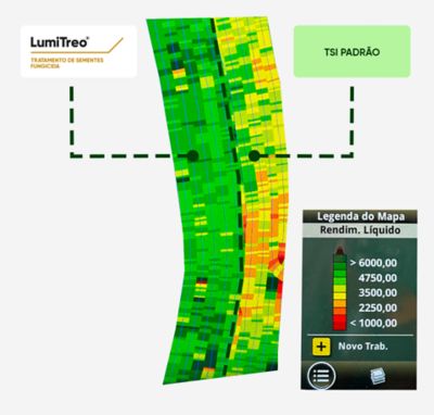 Observa-se, na Figura 2, o mapa de colheita do ensaio, no qual se verificou que o tratamento de sementes com LumiTreo® proporcionou maior proteção em comparação ao TSI padrão, resultando em um ganho de 17 sc/ha na produtividade.
