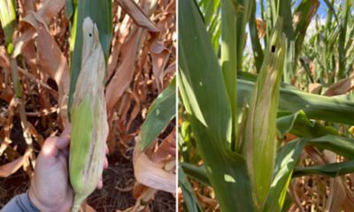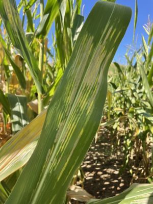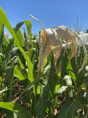 Podem ocorrer lesões no pendão; contudo, esses danos geralmente são pontuais dentro da área e, na maioria das situações, não reduzem a eficiência da polinização (Imagem 3). Em cenários de déficit hídrico combinado a temperaturas elevadas, também pode haver ocorrência de escaldadura nas folhas da espiga e nas brácteas (Imagem 4).