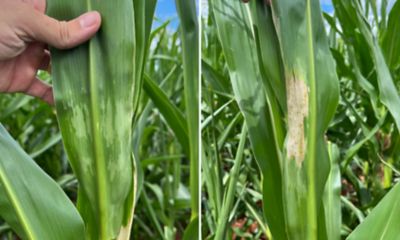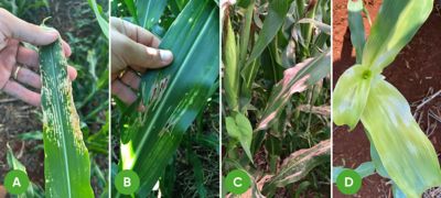 Imagem 6 - Fitotoxidez de fungicida (A), queima de tecido foliar por adubo nitrogenado (B), lesão de turcicum (C) e fitotoxidez de herbicida (D) | Fotos: José Madalóz e Thiago Prado.