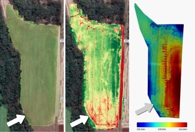 Imagem 7 - Ortomosaico com imagens de drone da área (A); ortomosaico de saúde vegetal, destacando a porção com maior intensidade de sintomas de escaldadura (B); e ortomosaico de altitude (C), município de Entre Rios do Oeste/PR | Fonte: imagens produzidas no DroneDeploy por Fernando Zanatta.