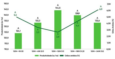 Acima do nível de equilíbrio na relação N/K, foram observados aumentos na incidência de grãos ardidos, relacionados ao desequilíbrio entre os nutrientes. Para a produtividade, também foi observada uma resposta positiva até o ponto de equilíbrio entre os nutrientes, confirmando que a relação N/K mais equilibrada é a mais rentável do ponto de vista produtivo.