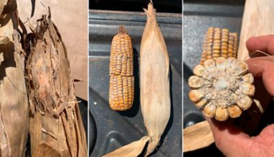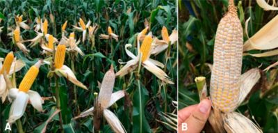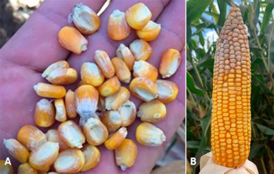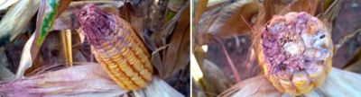 A infecção nas espigas resulta em uma redução no potencial produtivo, pois os grãos se deterioram, tornando-se leves e adquirindo uma coloração marrom clara (imagem 4). Esse problema compromete a qualidade do milho, além de prejudicar sua qualidade nutricional e palatabilidade.