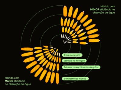 Na figura, são apresentados fenótipos de espigas observados com diferentes momentos de déficit hídrico gerando falha reprodutiva para dois híbridos que contrastam em resposta à seca, sendo um tolerante ao estresse hídrico e outro suscetível. A faixa externa mostra espigas de uma planta cultivada sem déficit hídrico (bem irrigada).