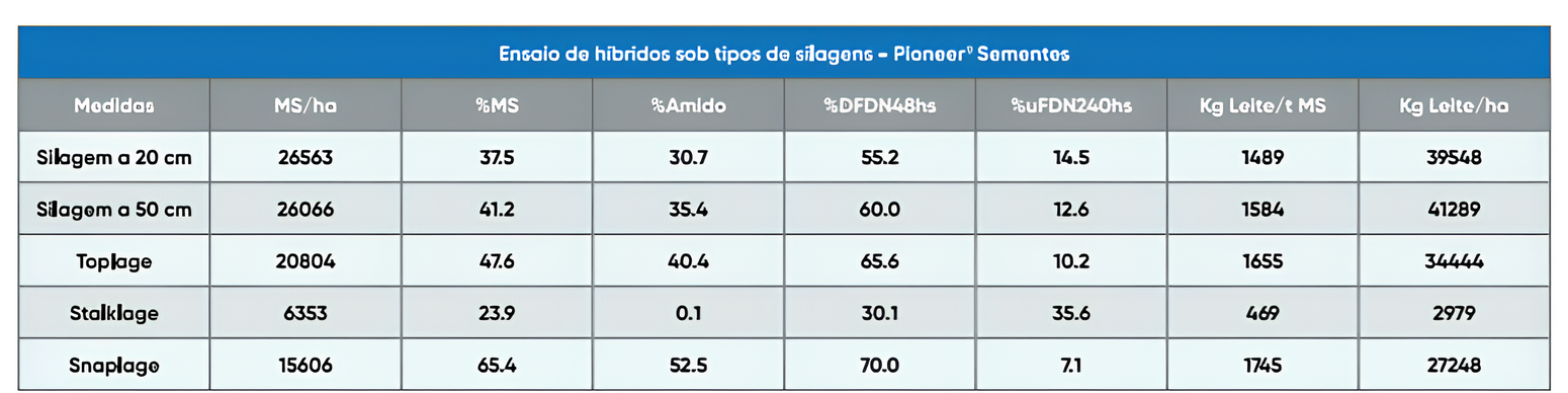 Os ensaios foram realizados em Minas Gerais, de 2020 a 2023, sob alto investimento, e analisaram os híbridos Pioneer® nas seguintes modalidades de silagem: silagem planta inteira colhida a 20 cm do solo, silagem planta inteira colhida a 50 cm do solo, silagem da parte superior (de 80 a 100 cm), silagem de colmo (stalklage), silagem de espigas (snaplage) e silagem de grãos úmidos.