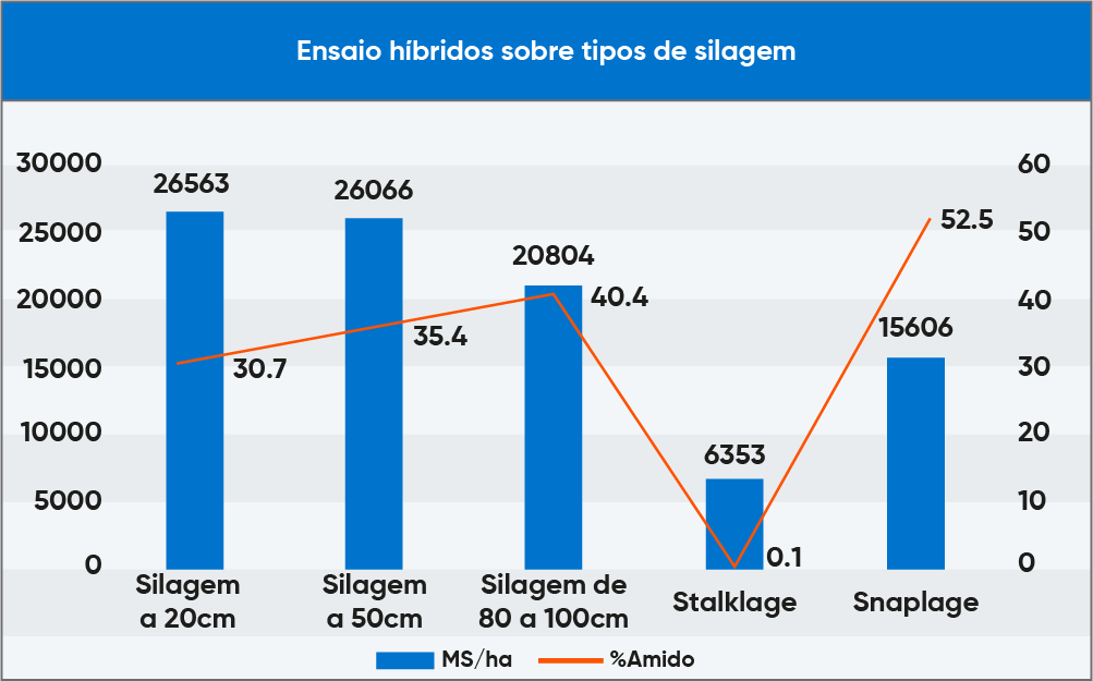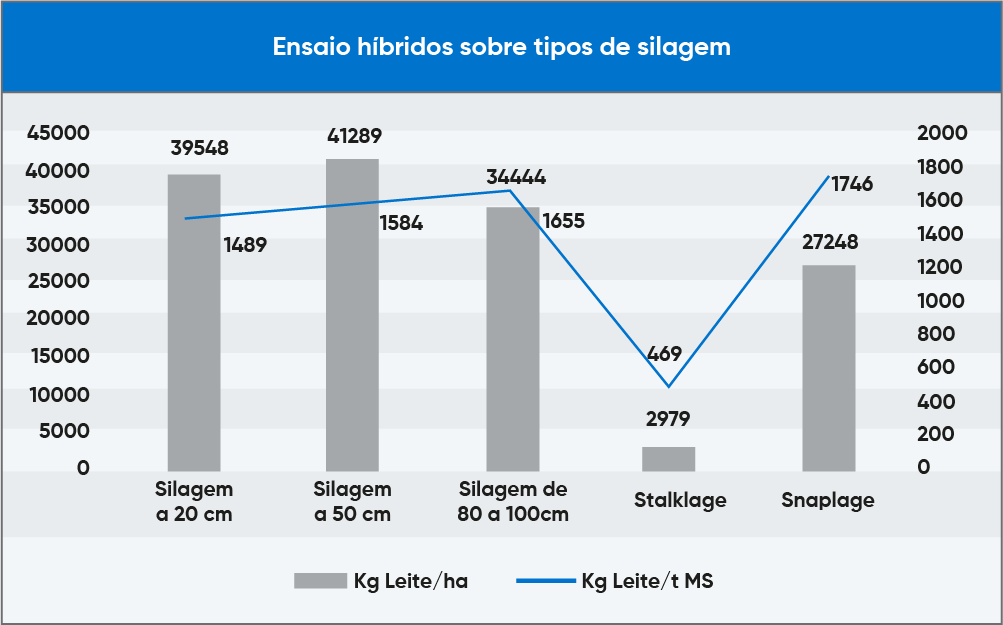 Como se pode observar na tabela abaixo, a diferença de altura de corte de 30 cm resultou em uma produtividade aproximada de 500 kg/ha de matéria seca (MS), o que equivale a aproximadamente 1.500 kg/ha de massa verde com média de 33% de MS. Todavia, foi observado uma melhora considerável na qualidade da silagem cortada a 50 cm comparada à de 20 cm, as quais podemos destacar sua maior digestibilidade da fração de fibra da planta (FDN), maior valor percentual de amido (+5% para ambos os parâmetros) e maior nível energético de conversão em kg leite/t MS ingerida (+100 kg leite/t MS), resultado em maior volume de kg de leite/ha.