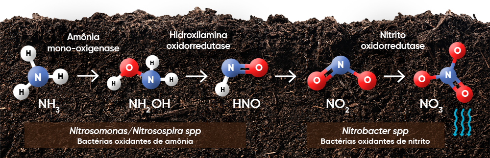 o 1ª: oxidação da amônia (NH3) em nitrito (NO2-);