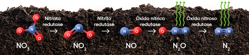 A desnitrificação (Figura 2) ocorre em solos saturados. As maiores perdas de nitrogênio por desnitrificação geralmente ocorrem no início do ciclo de cultivo, uma vez que as precipitações são frequentes e a absorção do nitrogênio aplicado é baixa, pois as plantas ainda não têm o sistema radicular totalmente desenvolvido.