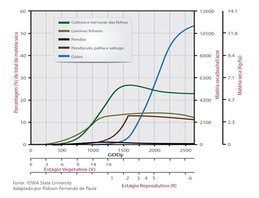 O acúmulo de MS do grão representa aproximadamente 45% do total do peso seco no início de R5, deixando mais da metade para ser acumulado durante o restante do período. Quando os grãos atingem o estádio de R5.5 (1/2 da linha do leite), aproximadamente 90% do total da matéria seca do grão já existe. A ocorrência de estresses ambientais durante R5 resulta na redução de carboidratos providos pela planta, o que implica na redução de peso dos grãos e, consequentemente, em menor produção de amido.