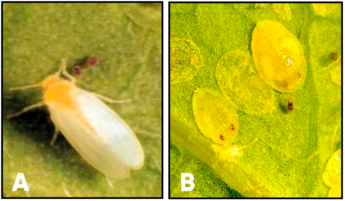 A mosca-branca (Bemisia tabaci; Hemiptera: Aleyrodidae) é um inseto de ampla distribuição geográfica nas regiões de cultivo do Brasil. O adulto possui entre 1 e 2 milímetros de comprimento, sendo as fêmeas ligeiramente maiores que os machos. Nesta fase, têm dois pares de asas membranosas recobertas por uma substância de coloração branca, originando seu nome popular (Figura 1 A).