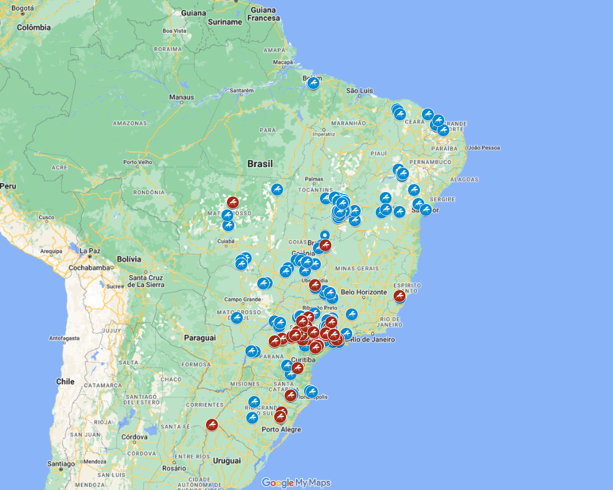 Figura 3 – Mapa de distribuição dos biótipos de mosca-branca (em azul Biótipo B, em vermelho Biótipo Q) | Fonte: https://www.fca.unesp.br/#!/pesquisa/gpmb/mapas/