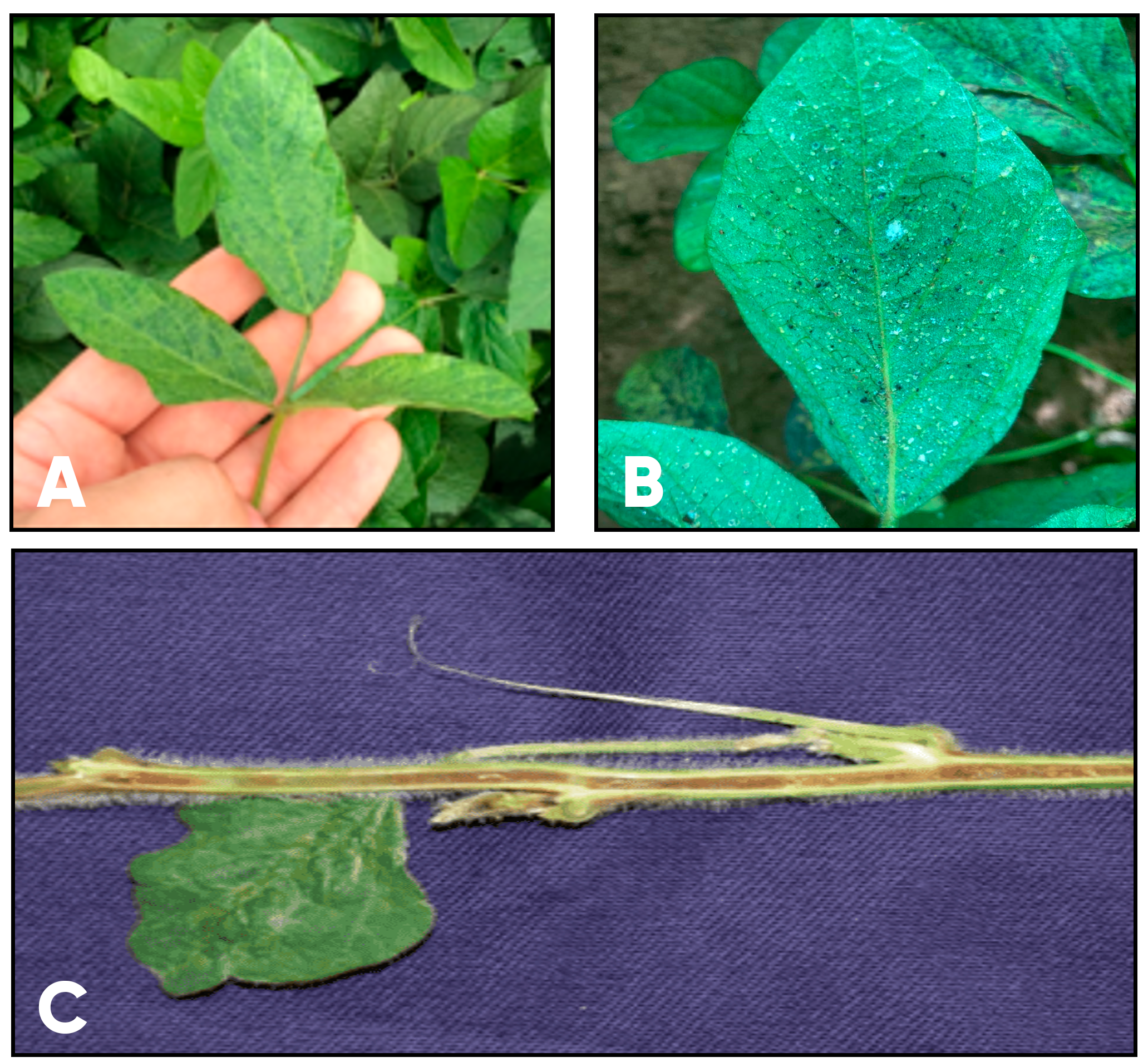 A transmissão de viroses da soja também é um dano importante caso as populações de mosca-branca estejam com alto índice de infecção. Dentre as viroses, a mais importante é a necrose da haste (CpMMV, gênero Carlavirus) (Figura 4 A e C) que ocasiona perto de 100% de perdas em cultivares suscetíveis.