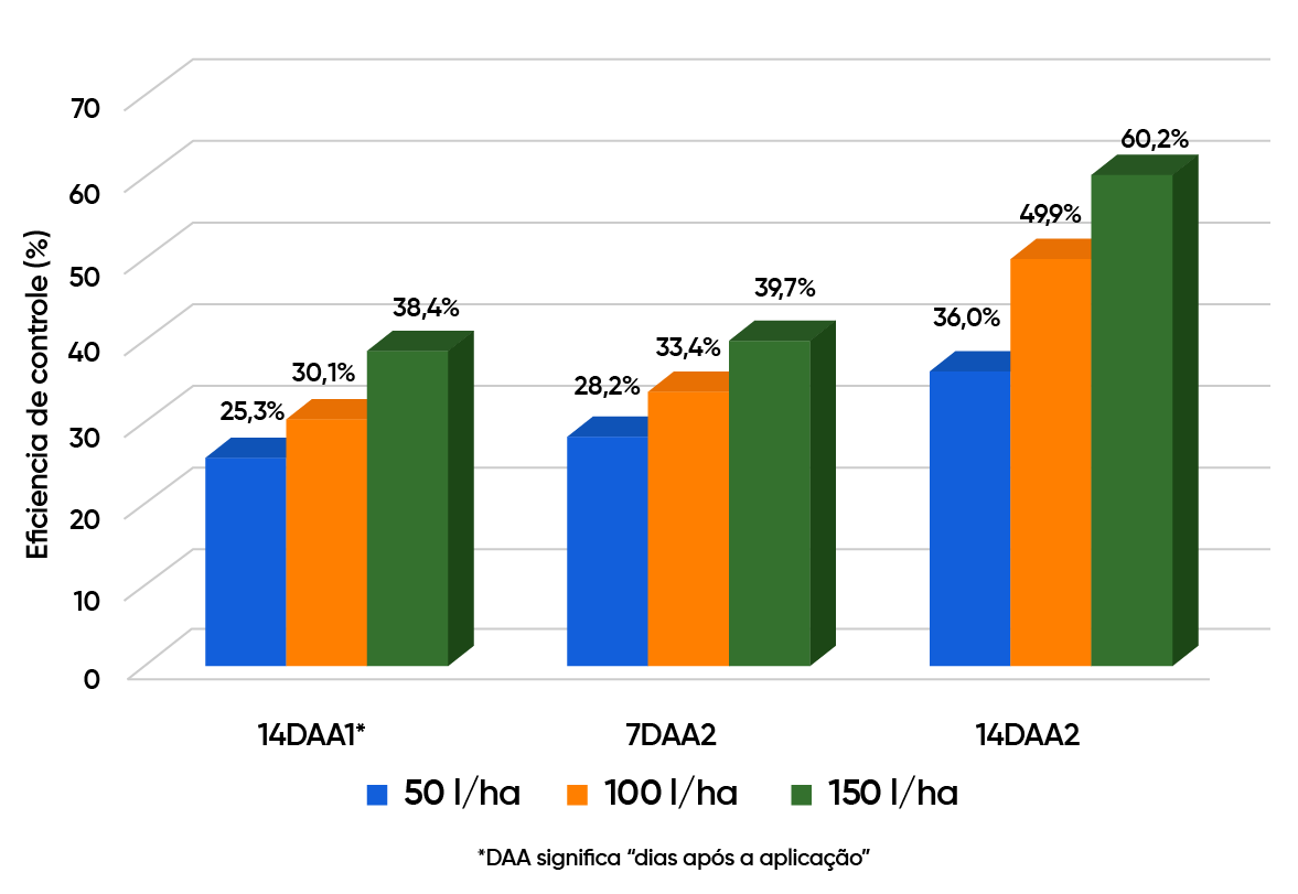 Sabe-se que o volume de calda de 150 L/ha é pouco usual a campo, porém se forem realizadas as aplicações com volume de calda de 100 L/ha, já há uma melhora no controle: de 15,9% aos 14 dias após a primeira aplicação e 27,8% aos 14 dias após a segunda aplicação.