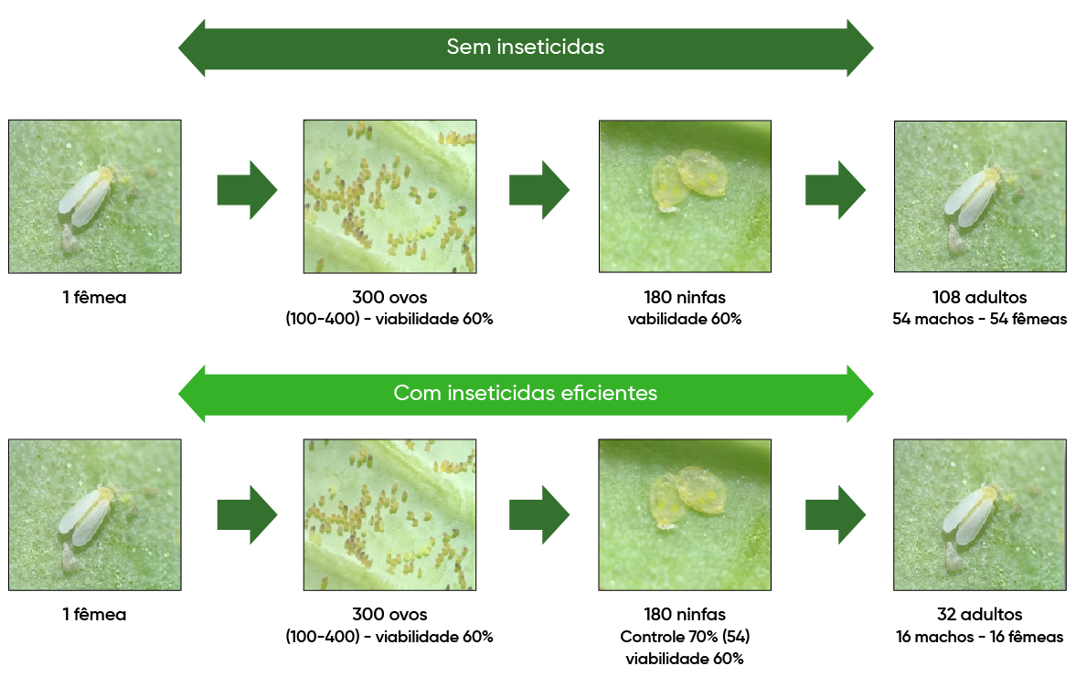 Em condições ideais (temperatura, umidade, presença de hospedeiros e ausência de controle), a população de mosca-branca pode aumentar exponencialmente. Isso ocorre devido à rápida reprodução e falta de controle natural. Diante do exposto, observa-se a dinâmica populacional de mosca-branca quando se faz o uso do manejo adequado, reduzindo consideravelmente o número de indivíduos na próxima geração, facilitando o controle deste alvo na segunda geração (Figura 7).