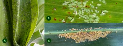 Os pulgões são insetos sugadores de seiva que vivem geralmente em colônias. Sua alimentação ocorre por meio da perfuração dos tecidos vegetais com o aparelho bucal do tipo sugador, retirando a seiva da planta e, ao mesmo tempo, podendo transmitir viroses. Na cultura do sorgo, destacam-se três espécies principais: o pulgão-da-cana-de-açúcar (Melanaphis sacchari), o pulgão-verde (Schizaphis graminum) e o pulgão-do-milho (Rhopalosiphum maidis).