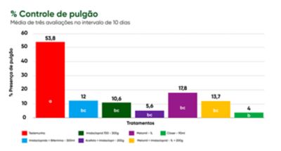 Entre os tratamentos avaliados, o Closer® (IsoclastTMactive, 90 ml/ha) destacou-se com o melhor desempenho, apresentando apenas 4% de presença de pulgões, valor significativamente inferior aos demais tratamentos. Esse resultado confirma a alta eficiência do produto no controle da praga, com redução consistente da população mesmo após o intervalo de 10 dias.