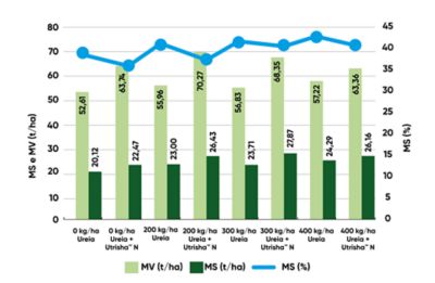 O principal destaque foi a produção de MS (matéria seca, t/ha): os tratamentos com Utrisha™ N, combinados com a adubação de cobertura com ureia 45%, apresentaram, em média, um acréscimo de 2,952 t/ha na produção de matéria seca.