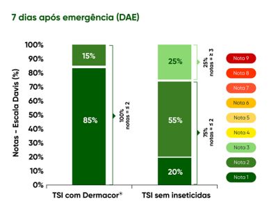 Aos 7 DAE, nas áreas tratadas com TSI completo (com Dermacor®), 100% das plantas apresentaram notas de severidade ≤ 2, indicando injúrias leves e plenamente controladas. Nesse cenário, a lavoura permaneceu abaixo do nível de ação, não havendo necessidade de intervenção foliar.
