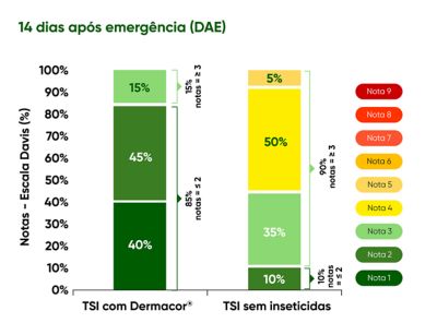 Aos 14 DAE, o diferencial entre os tratamentos tornou-se ainda mais evidente. As lavouras tratadas com Dermacor® mantiveram 85% das plantas com notas ≤ 2, permanecendo abaixo do limiar de 20% de plantas com notas ≥ 3, o que indica manutenção do controle e postergação da necessidade de aplicação foliar.