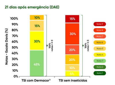 Aos 21 DAE, observa-se o impacto acumulado do manejo inicial. Nas áreas com TSI + Dermacor®, embora 100% das plantas apresentem notas ≥ 3, há predominância de danos moderados e distribuição mais equilibrada das notas de severidade, refletindo maior capacidade de sustentação do estande, preservação da área foliar funcional e melhor recuperação fisiológica das plantas.